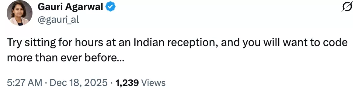 The woman in the picture is an Indian-origin tech entrepreneur and co-founder of San Francisco-based AI startup KoyalAI, Gauri Agarwal. The picture was shared by her brother, Mehul, on his social media handle, X. He mentioned that his sister, who is a co-founder of their startup, is busy fixing a critical bug. The bride's brother quickly added that their parents yelled at them. He wrote: