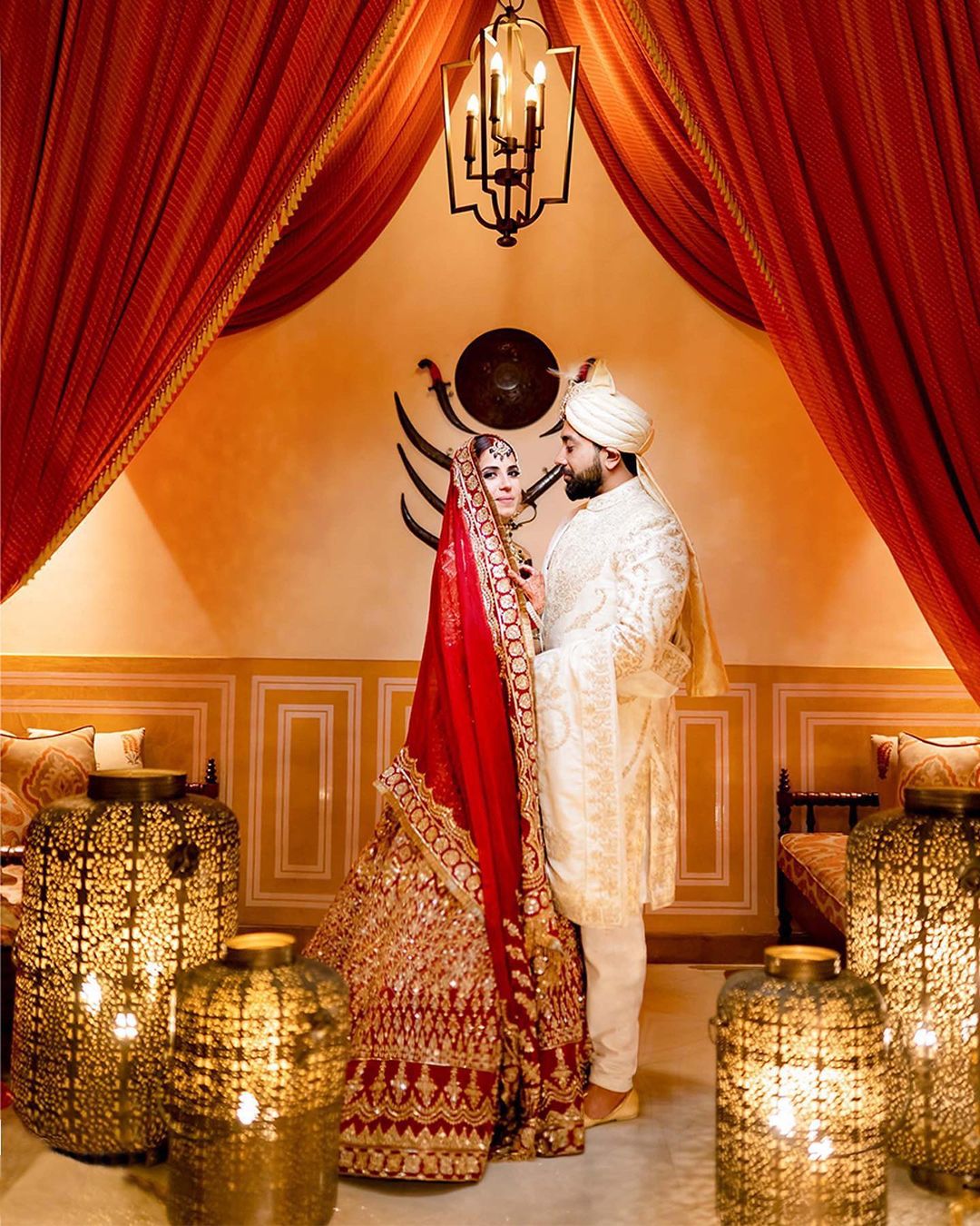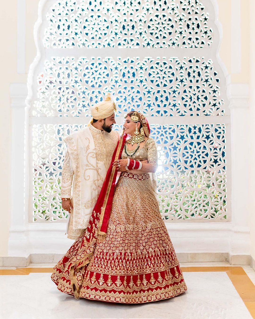 The bride of the week, Palak Kalra, lives in the United Kingdom. The gorgeous bride had opted for a Manish Malhotra lehenga for her biggest day over a video consultation. Her red lehenga had a modern take on the traditional phulkari design. It was embroidered in shades of gold zari, sequins, beads, and crystals. The lehenga skirt was paired with a geometrical embellished bugle beaded choli and a dupatta with tasselled border.