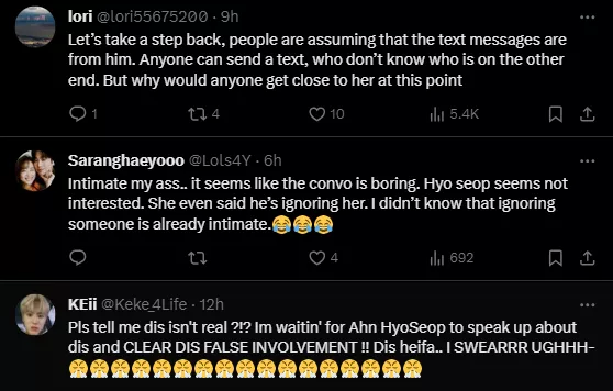 The article was also shared on X (formerly Twitter), and netizens have been expressing their opinions on the matter. While most netizens are asking why Ahn Hyo Seop would get involved with someone like Han Seo Hee, others are praying that he gets over this safely. A user said, “At this point if a celebrity actively chooses to befriend this woman, they’re bringing it on themselves. She has shown time and time again how fast she will turn on people and expose their secrets.” Another one wrote, “Not Ahn Hyo Seop too. But she could’ve just fabricated the whole conversation.” A third comment can be read as “If you still associate yourself with her after what happened to TOP and Wonho, which was worldwide news... then you deserve for your career to flop. Have fun.”