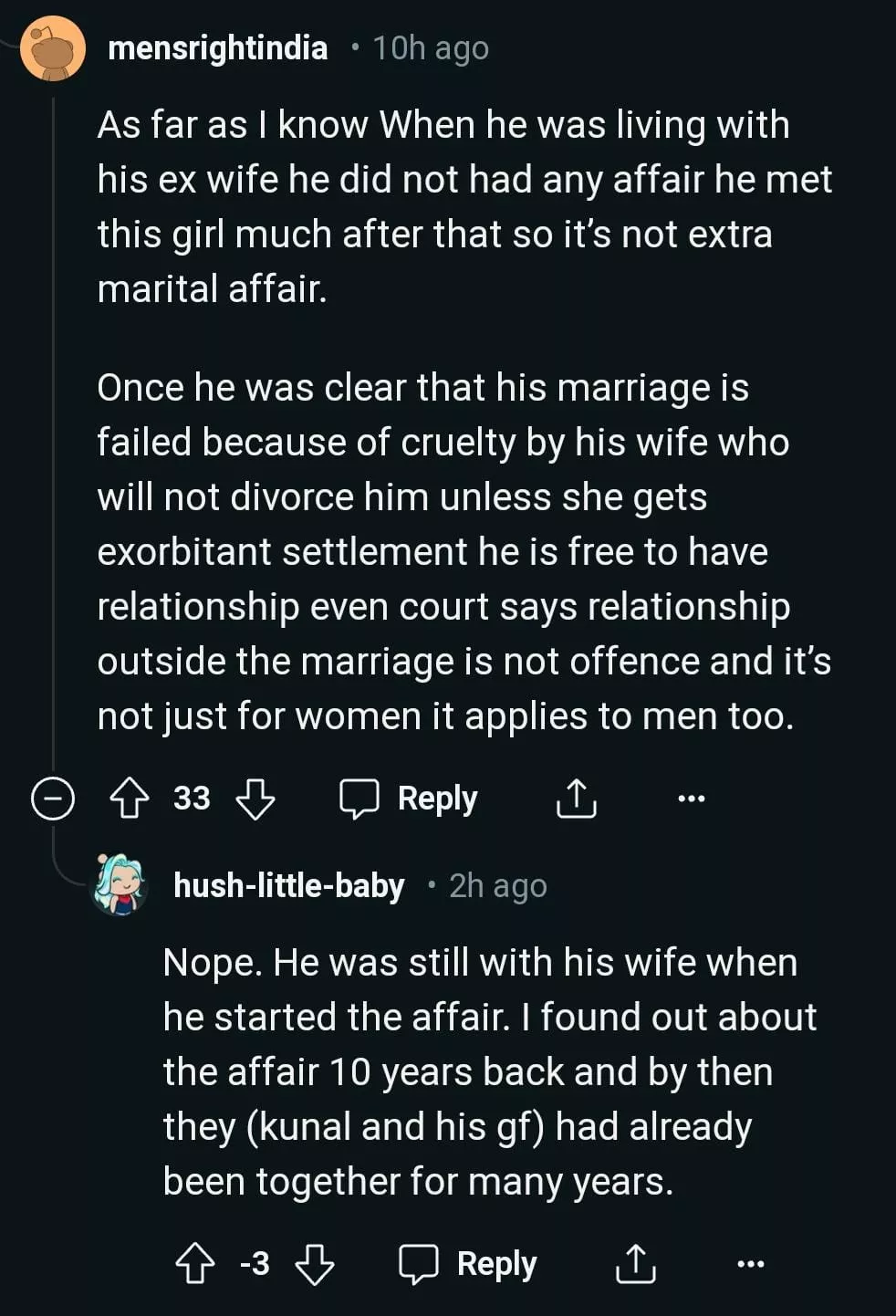 Soon after the Redditor posted the bench's judgement regarding Kunal Kapoor's divorce from his estranged wife, netizens started reacting to the same. A few social media users also pointed at Kunal's alleged extramarital affair, and mentioned that the chef often goes on trips with her. However, in reply to this, another netizen, who claimed to be an insider in this case, mentioned that the girl in those pictures with Kunal is only good friends with him and nothing more.
