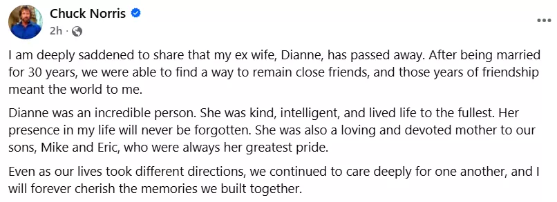 In the same note, he further stated how Dianne Holechek's presence will never be forgotten. Chuck Norris reflected on how devoted Dianne was towards their family. He concluded the note by stating that, even though their marriage had ended, they cared deeply for each other and that he would cherish the memories he shared with her forever. He was quoted as saying: