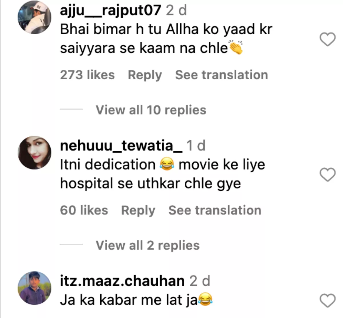 Soon netizens flooded the comments section. One user wrote, "Bhai bimar h tu Allha ko yaad kr saiyyara se kaam na chale." A second one commented, "Itni dedication movie ke liye hospital se uthkar chle gye." A third netizen penned, "Are bhai pahle ilaaj to kar le FIR movie dekhna."