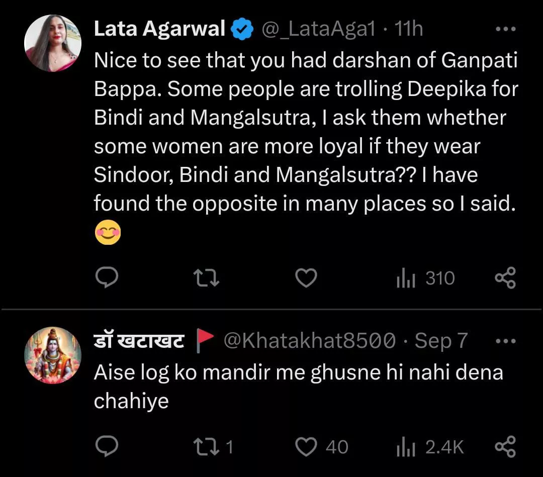 Deepika's fans hit back at the trolls and wrote, "Nice to see that you had darshan of Ganpati Bappa. Some people are trolling Deepika for Bindi and Mangalsutra, I ask them whether some women are more loyal if they wear Sindoor, Bindi and Mangalsutra?? I have found the opposite in many places so I said." Such trolling on the actress, when she is about to embrace motherhood, is surely meaningless and the actress' fans remained irked by the recent debate on X about her not wearing a mangalsutra.