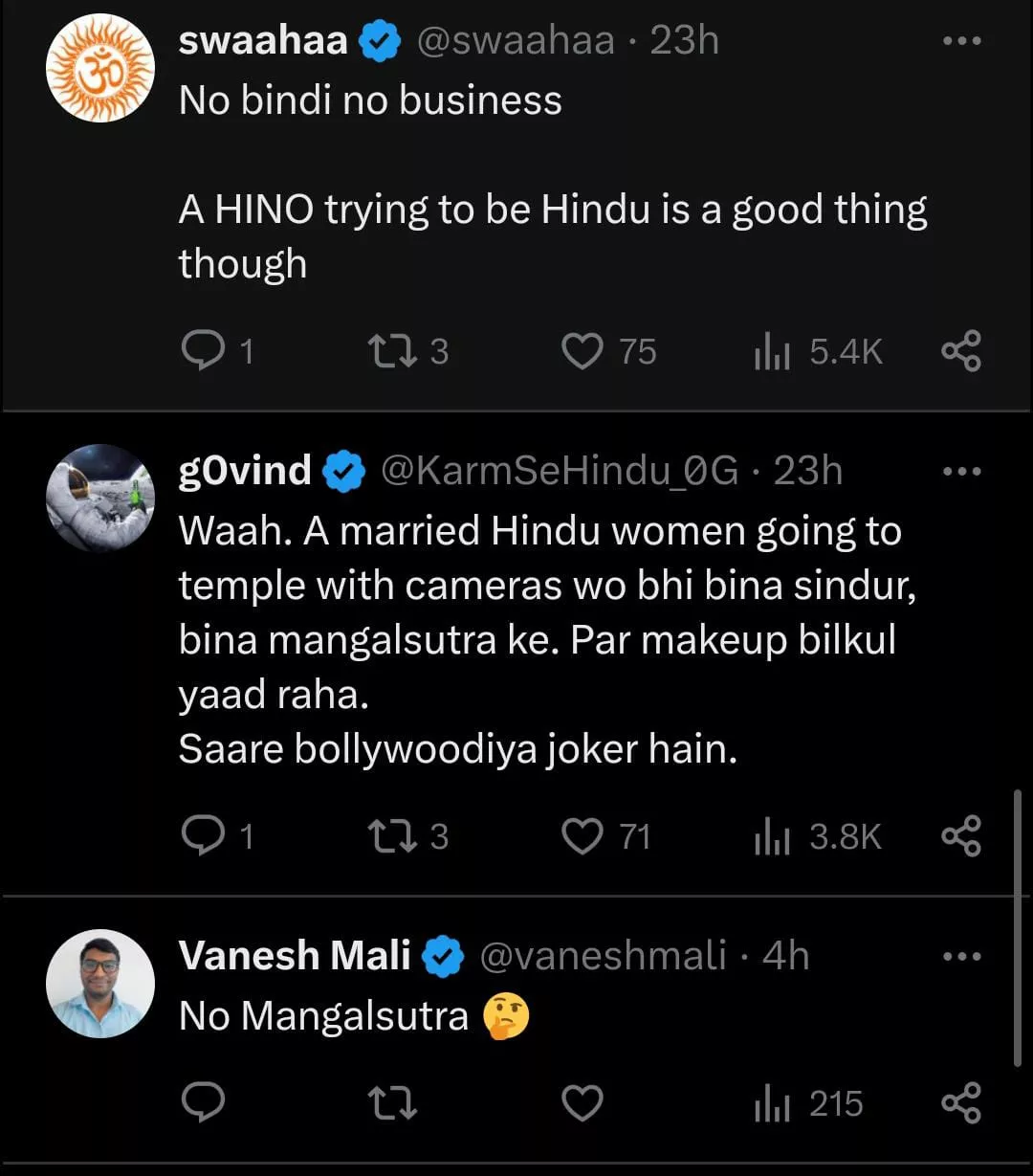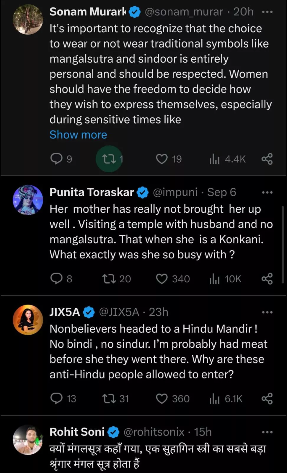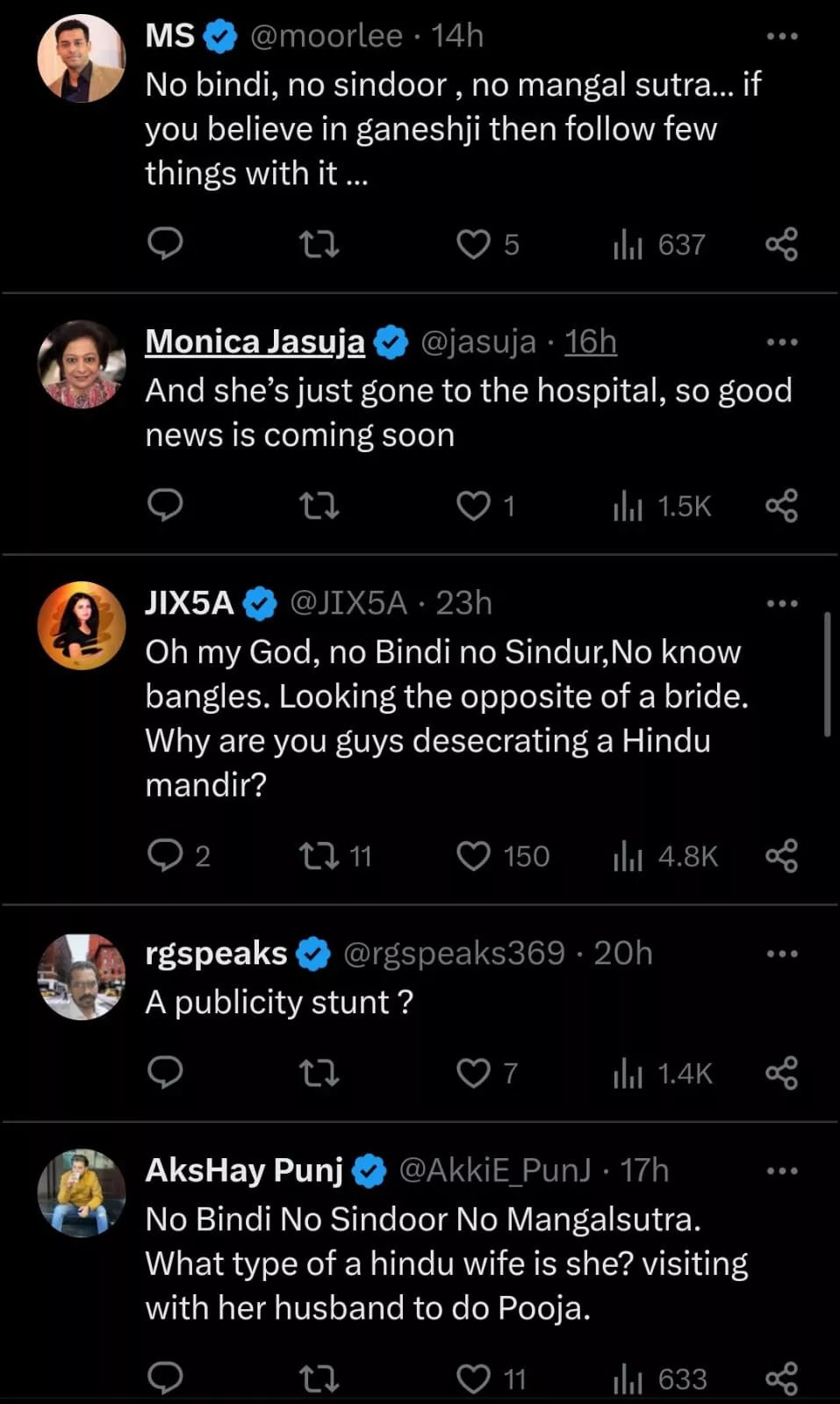 A user meaninglessly wrote, "Her mother has really not brought her up well. Visiting a temple with husband and no mangalsutra. That when she is a Konkani. What exactly was she so busy with ?" Another user wrote, "No bindi, no sindoor, no mangal sutra… if you believe in ganeshji then follow few things with it."