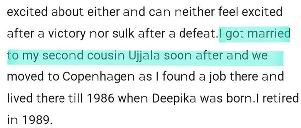 "I got married to my second cousin Ujjala soon after and we moved to Copenhagen as I found a job there and lived there till 1986 when Deepika was born. I retired in 1989."