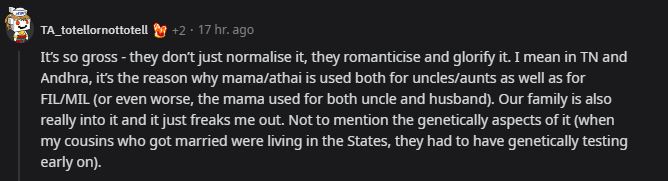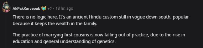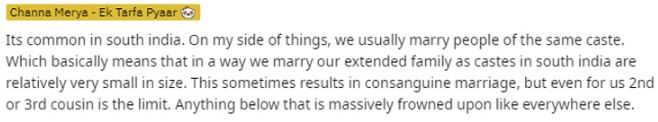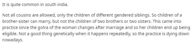 "Its common in south india. On my side of things, we usually marry people of the same caste. Which basically means that in a way we marry our extended family as castes in south India are relatively very small in size."
