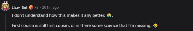 "I don’t understand how this makes it any better. First cousin is still first cousin, or is there some science that I’m missing."