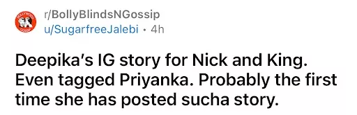"Deepika’s IG story for Nick and King. Even tagged Priyanka. Probably the first time she has posted sucha story."