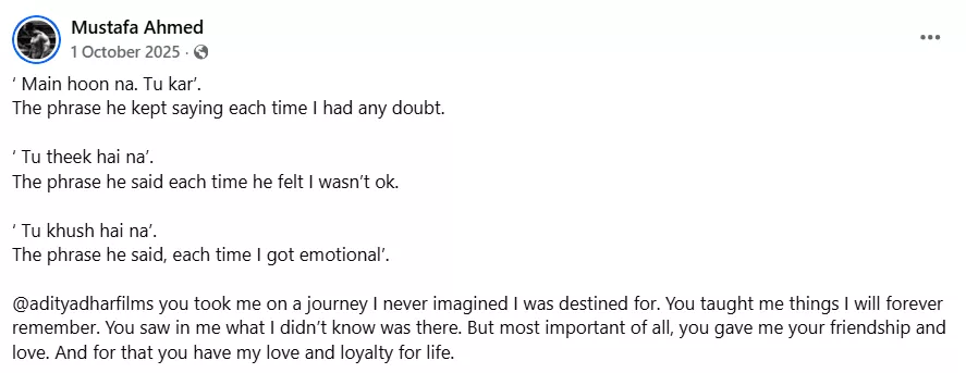 "'Main hoon na. Tu kar.' He would say this whenever I doubted myself. ‘Tu theek hai na’ when I wasn’t okay. 'Tu khush hai na' when I got emotional. Aditya Dhar, you took me on a journey I never imagined. You saw in me what I didn’t know existed. But most importantly, you gave me your friendship and love—and for that, you have my loyalty for life."
