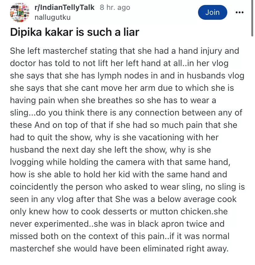 After reports of Dipika leaving the show went viral, the actress confirmed the same. She revealed that due to an injury in her shoulder, she was unable to move her hand cook as she felt shooting pain. Now, a Reddit user took to the discussion platform and pointed out how Dipika lied about her injury as she went on a vacation with her husband, Shoaib Ibrahim, the next day. The post further highlights how Dipika was able to hold her child and do house chores as she claimed that she had so intense pain that she had to leave the show.