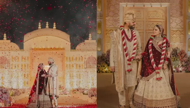 For the celebrations, Diva opted for bold and experimental looks. While she chose a traditional Tarun Tahiliani lehenga for her sangeet, she stunned in an Anamika Khanna ensemble for both the welcome dinner and the mehendi ceremony. She wore a muted-toned, embellished co-ord set, accessorised with a statement haar and matching ear cuffs. Her henna-clad hands beautifully enhanced her bridal glow. Jeet complemented her perfectly, looking dapper in a pastel kurta set paired with a floral jacket.