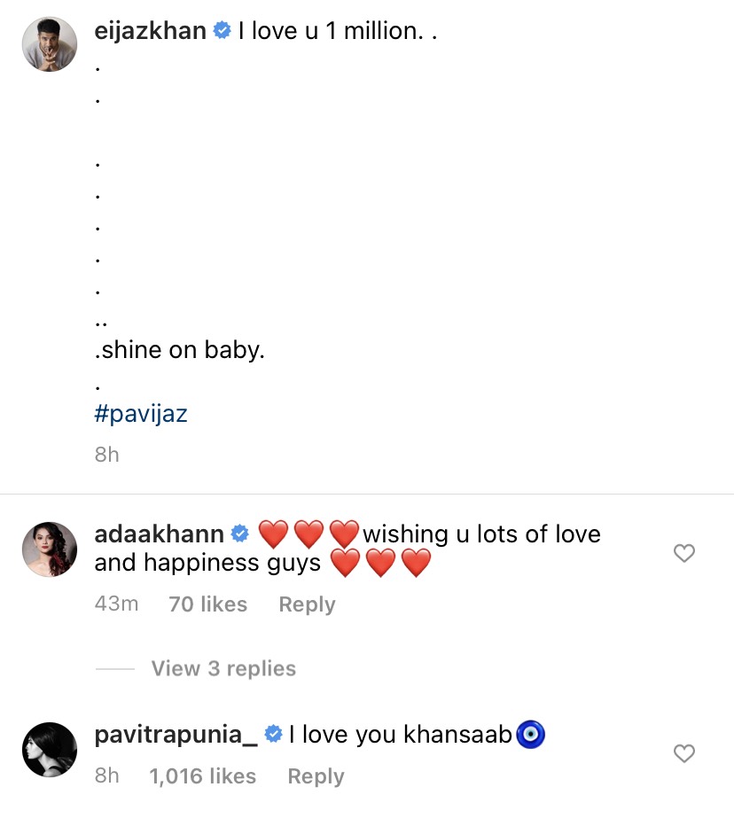 Ever since then, Pavitra and Eijaz have been painting the town red with their PDAs, mushy pictures and comments. The actor has again dropped a mushy ‘love you’ post for Pavitra as the actress has hit 1 million followers on her IG handle. Yes, as Pavitra’s IG family is growing, Eijaz took to his IG handle and posted a series of pictures and a video, where the two can be seen sitting cosily, posing for the camera. From hugging to kissing each other, the couple can be seen lost in love. Along with the pictures and a video, Eijaz wrote, “I love u 1 million. shine on baby. #pavijaz.” Soon, Pavitra dropped a cutesy comment on her Khansaab’s post and wrote, “I love you khansaab” with a nazar emulet emoji. Take a look: