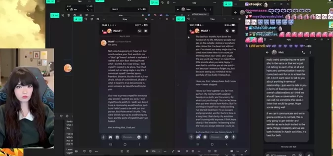 Rumors have long swirled around that Emiru and Mizkif were romantically linked. Duo's dating speculation began with the idea that they were roommates, colleagues, and close friends. Although buzz has always been rife that there might be a romantic angle between the duo, they never publicly confirmed being in a relationship, until Emiru's livestream on October 25, 2025. Emiru confirmed being in a relationship by sharing a series of screenshots featuring multiple lengthy messages of apology, requests for reconciliation, and more, which she left unresponded.