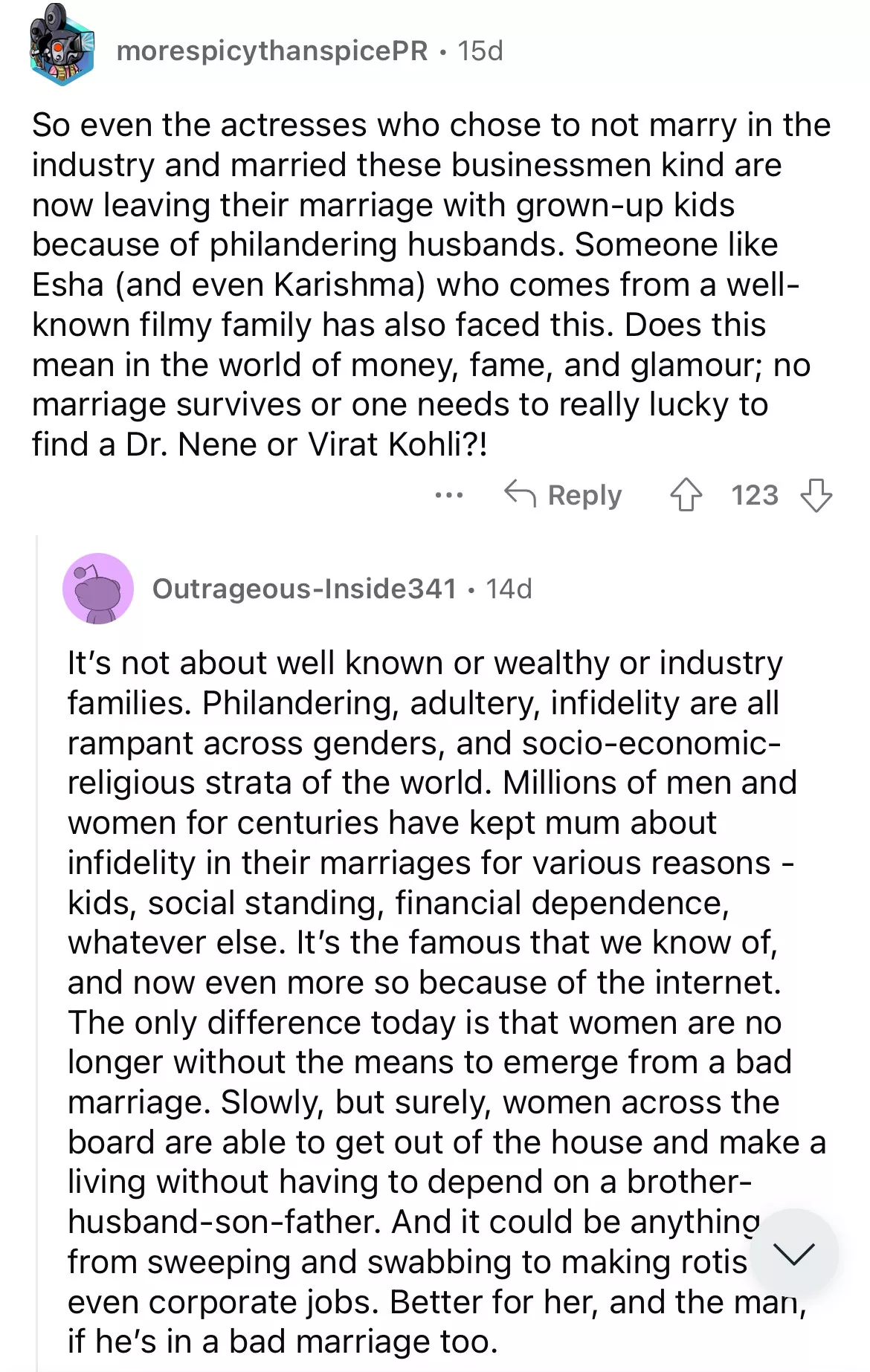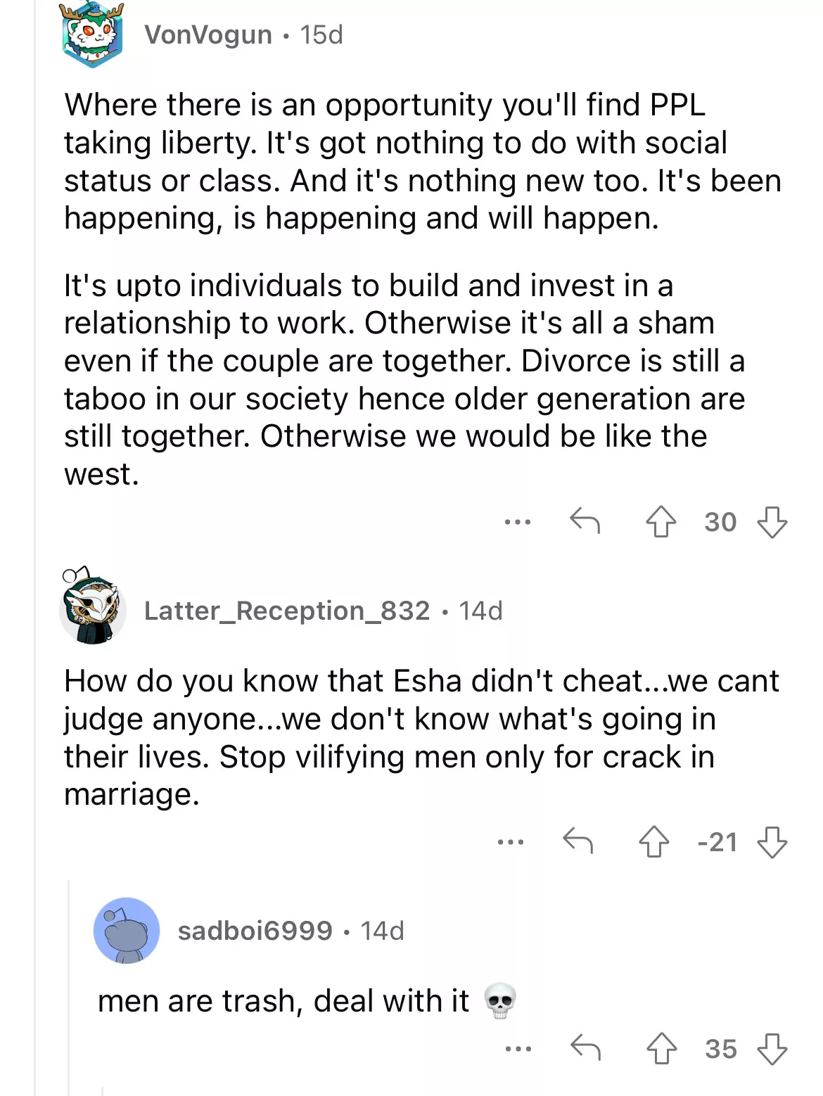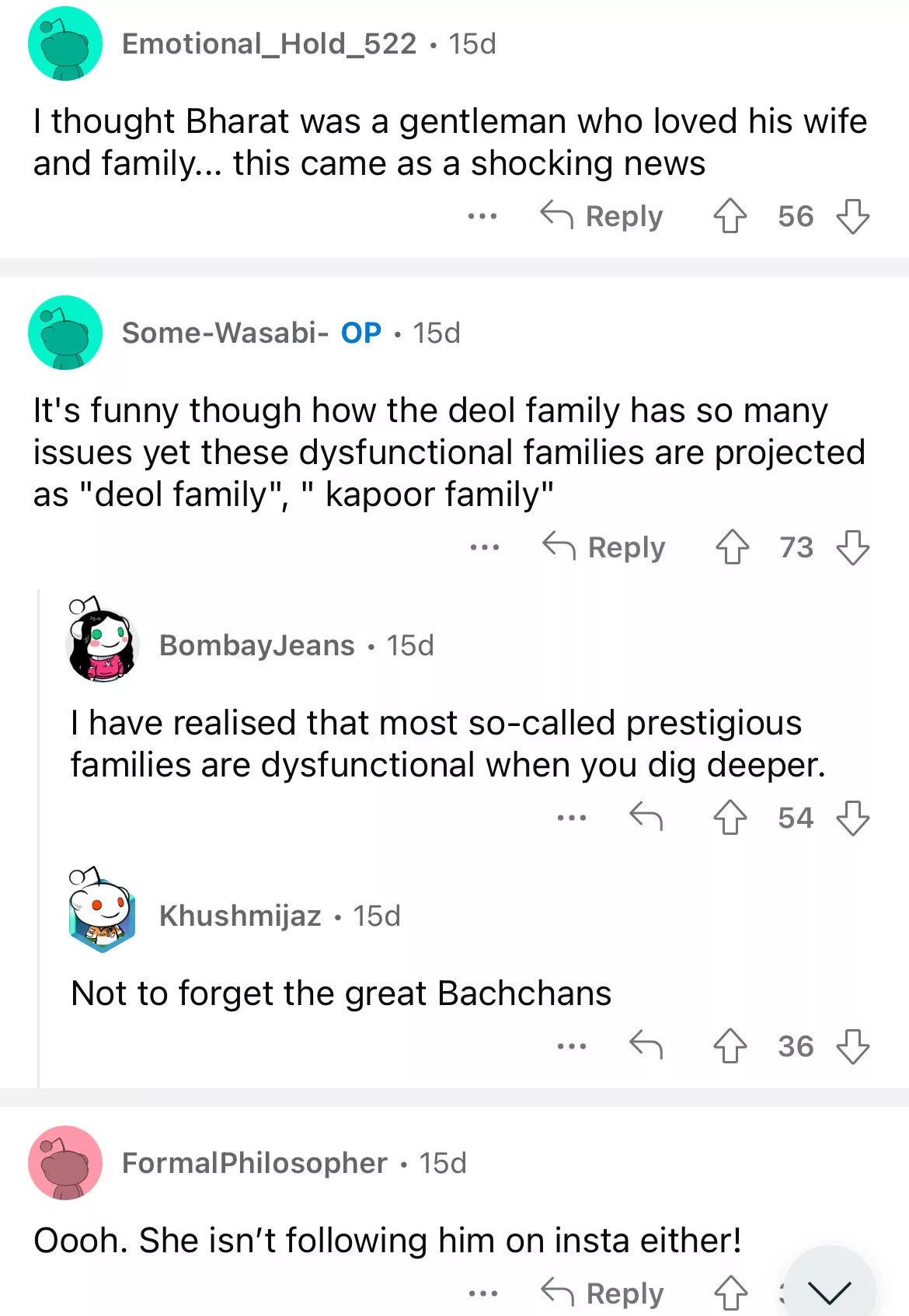 Soon after the post was shared on Reddit, netizens flooded the comment section with their reactions to the same. A netizen commented, "I thought Bharat was a gentleman who loved his wife and family... this came as a shocking news." Another penned, "Is that really his gf? Esha seems to have a good relationship with husband, mother in law and his brothers too." Check out the comments below: