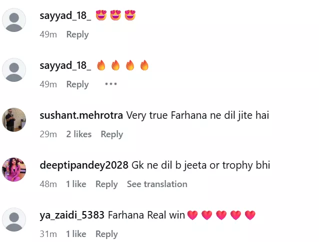 Netizens on social media have been commenting on Farrhana Bhatt being the real winner. Supporting the actress, a user wrote on social media, “She's so strong. Here I can't stop crying and look at her, posing for paps as if nothing happened”. Another fan of Farrhana said, "The fact that Salman & Gaurav were so salty at this moment and chose to taunt her instead of embracing her shows who the real winner is.”