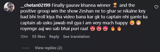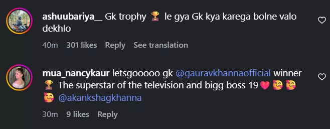 Within a few minutes of posting Gaurav pictures with the Bigg Boss 19 trophy, netizens flooded the comment section. One Insta user wrote, "Gk trophy le gya, Gk kya karega bolne valo dekhlo." Another netizen stated, "Congratulations.....Finally our inspiration and man with a class won the trophy, GK you are a gentleman." A third Insta user penned, "Finally gaurav khanna winner and the positive group win the show Zeshan ne to ghar se nikalne key bad bhi troll kiya tha video bana kar gk tu captain nhi gante ka captain ab usko jawab mil gya I am very much happy royenge aaj wo sab bhai puri raat."