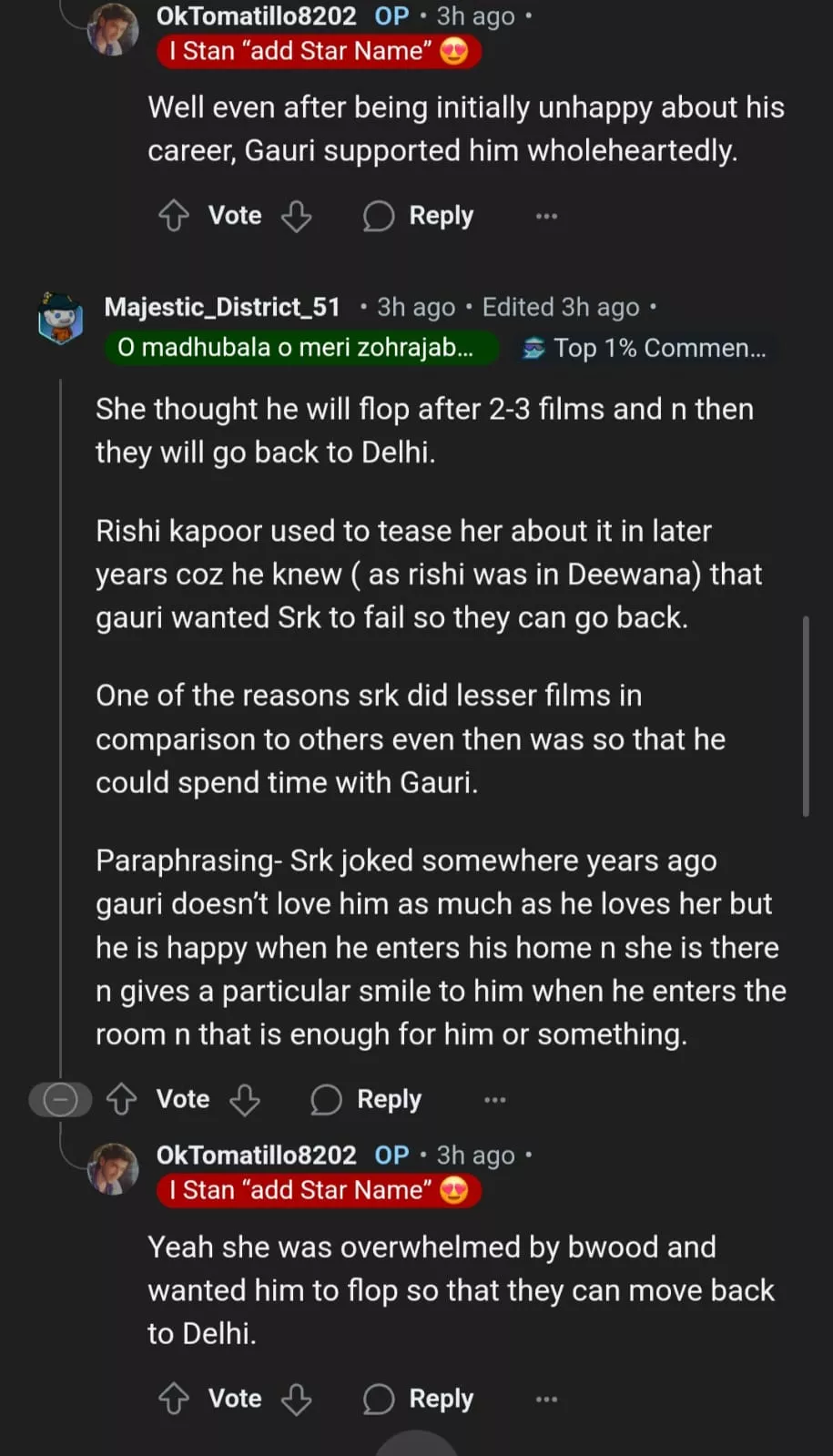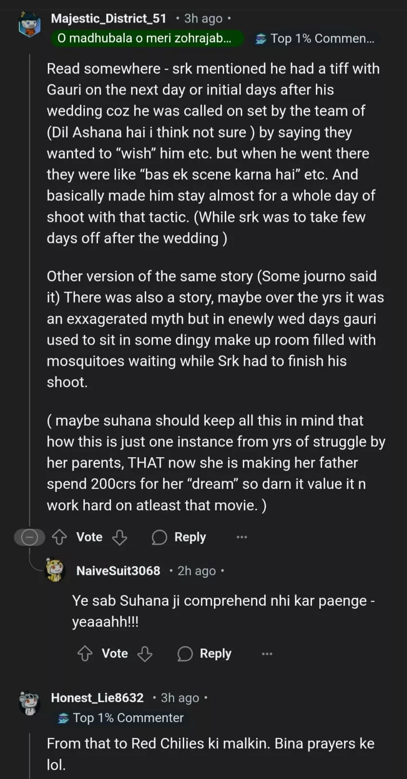 Netizens on Reddit took to the comment section to express their thoughts about Gauri Khan's honest admissions. One user penned, "She was the og CHILL GIRL," while another wrote, "From that to Red Chilies ki malkin. Bina prayers ke lol.” Other users weighed in with stories they had heard about the couple in past interviews, with one user commenting, "One of the reasons srk did lesser films in comparison to others even then was so that he could spend time with Gauri."