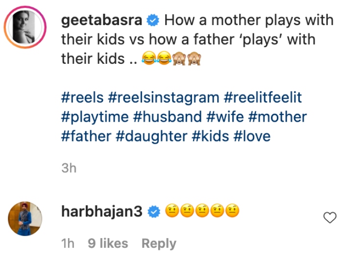 Geeta captioned the hilarious video as "How a mother plays with their kids vs how a father ‘plays’ with their kids". On this, Harbhajan instantly commented with a raised eyebrow emoji.