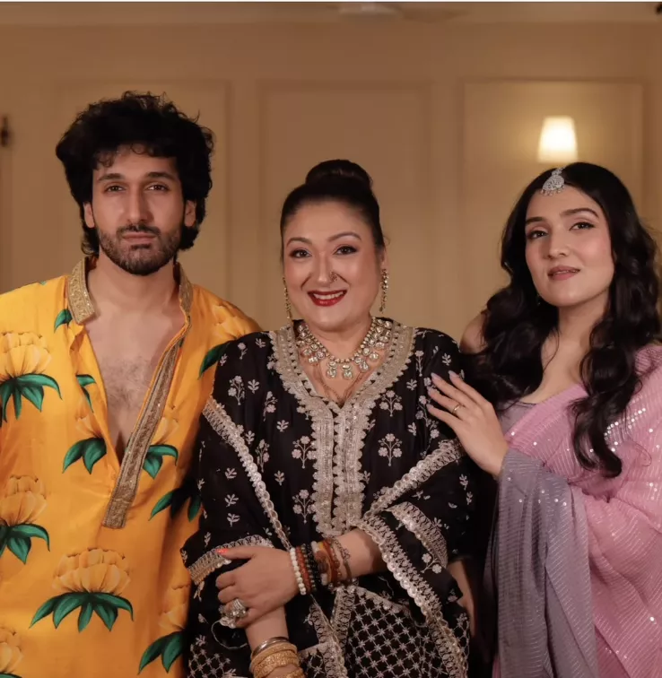 The gorgeous mother-daughter duo were dressed to the nines for the festivities. Sunita had donned a black sharara with heavy gold embellishments. She accessorised with a stone embellished neckpiece, matching earrings, multiple gold bangles, and beaded bracelets. Her daughter, Tina looked drop-dead gorgeous in a pink and grey ombre saree that she paired with minimal accessories, including a maang tikka and a bracelet.