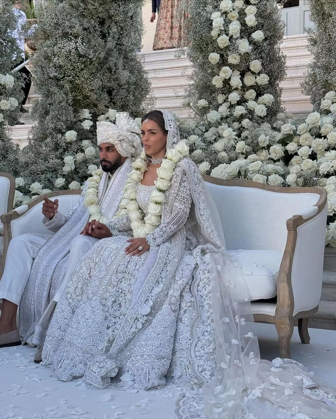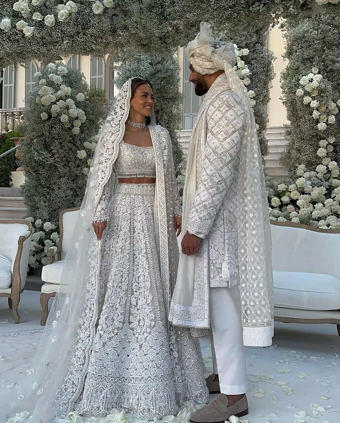 The couple had two wedding ceremonies. The first one was an Italian-style ceremony, and following that, we saw an Indian wedding involving dhol players and Bollywood dancers. For the first wedding, Nada opted for a custom bridal gown by the House of Dior. The Maria Grazia Chiuri dress featured a princess neckline in a pristine white hue, along with a long veil attached to her sleek bun. It was inspired by the famous wedding dress of Grace Kelly. She teamed her look with absolutely minimal accessories and makeup. On the other hand, Umar looked handsome in a black-hued tuxedo teamed with a white shirt underneath and a bow.