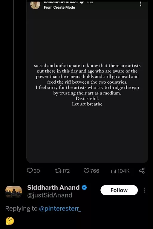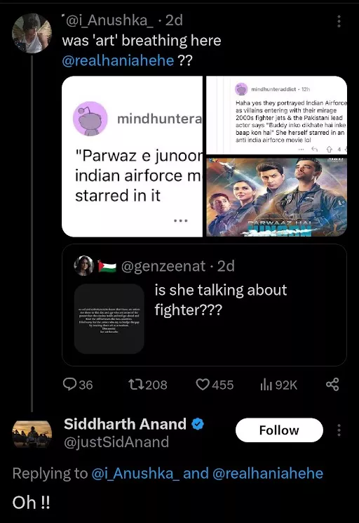 As soon as Hania Aamir posted her opinion on her social media, it was reposted by several users, and replying to one of the reposts on X (former Twitter) Siddharth Anand dropped his reply to Hania. The director replied, "Oh!" at one thread, and on another of the same post thread, he replied with a thinking emoticon. Check out his responses: