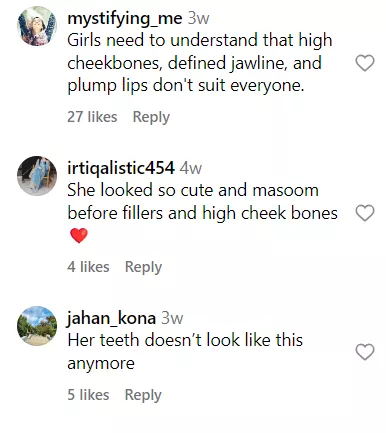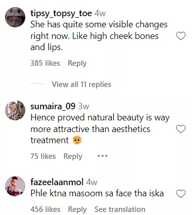 The video has been shared by a fan page and has garnered over 667k views. But our attention was caught by the comments shared by the netizens on the reel. Numerous IG users pointed out that Hania Aamir used to look very innocent and super cute, but now her facial features have changed completely. A user commented, “She has quite some visible changes right now, like high cheekbones and lips.” Someone else said, “Her chin, teeth, lips, and cheeks are so different now.” Check out the other comments:
