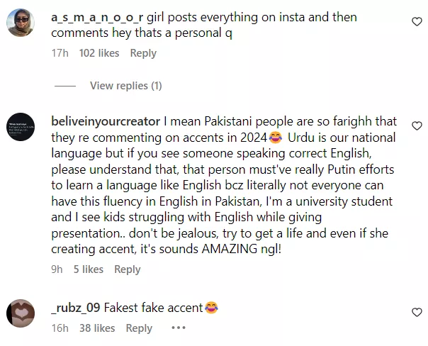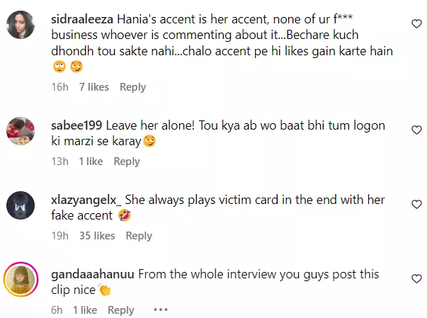 Galaxy Lollywood posted the same excerpt from the hour-long interview on its official Instagram page. Soon, netizens started reacting to Hania’s conversation with Haroon regarding rumours about her relationship with Badshah. One user said, “No, sis, if you'd roam around with guys like this, post cryptic stories with them from time to time, you can't expect people to not speculate what's going on in between!” Another one wrote, “I feel Hania enjoy such rumours. Getting linked with men seems to be her way to get talked about, hence posting such stuff on Instagram.” Meanwhile, a third netizen penned, “The accent is simply cringe.”