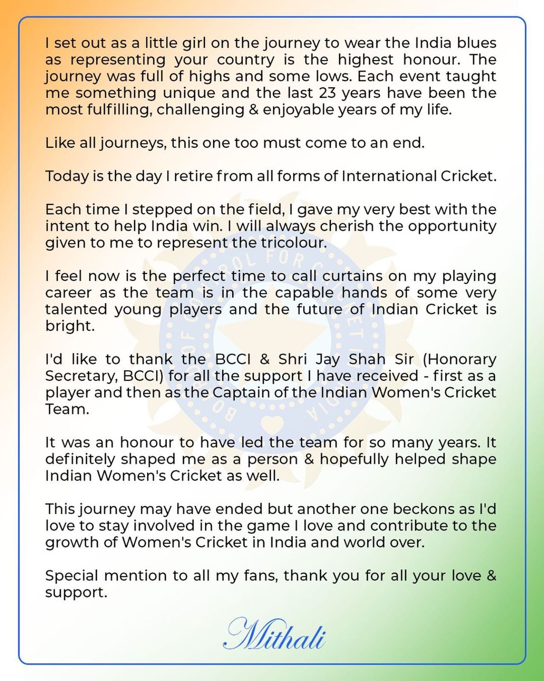 For the unversed, it was on June 8, 2022, when Mithali Raj had taken to her Instagram handle and had shared a picture in which she had announced her retirement from all forms of international cricket. In her long note, Mithali had thanked BCCI and her massive fanbase for always believing in her and supporting her for the last 23 years. An excerpt from her long note could be read as:
