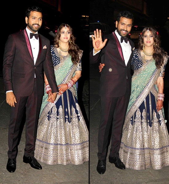 For the reception party, the groom chose to wear a stylish maroon suit. The newlywed bride, on the other hand made a spectacular picture in a turqoise and navy blue lehenga with silver work.