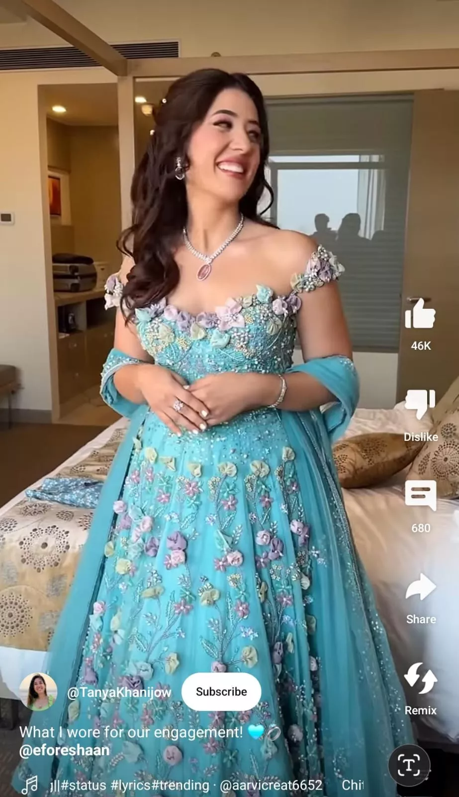 Recently, Tanya uploaded a short video on her YouTube channel in which she revealed the outfit she wore for her engagement. For her special day, she chose an aqua blue three-dimensional floral-embellished lehenga set from the shelves of the brand, Baya. The set consisted of a heavily hand-embroidered skirt, an off-shoulder choli with floral detailing on the strap, and a net dupatta. Tanya accessorised her outfit with pieces of diamond jewellery, comprising a sleek neckpiece, dainty earrings, a bracelet, and a ring.