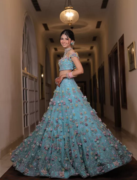 What are your thoughts on Tanya Khanijow’s beautiful aqua-blue floral embroidered lehenga? Let us know.
