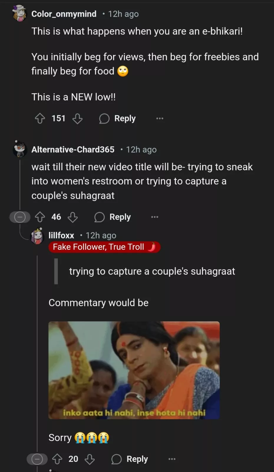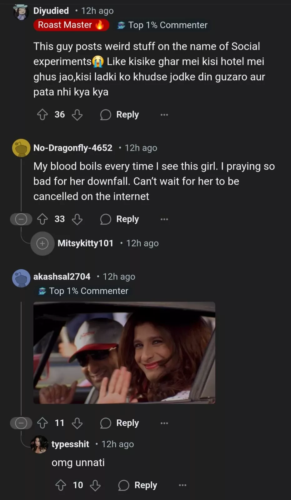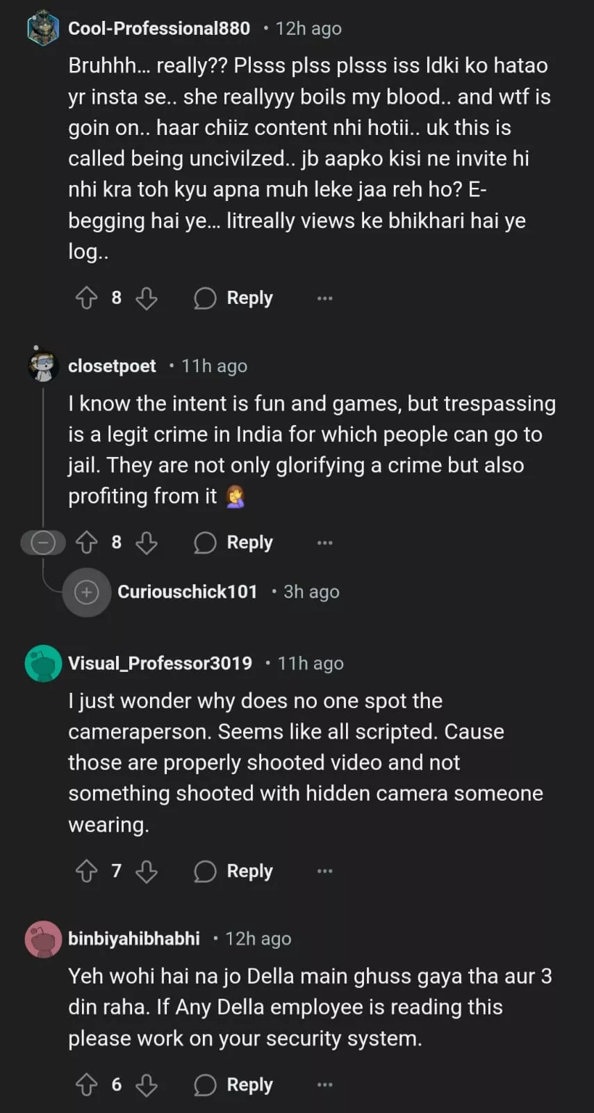 The OP's question prompted several answers from netizens, who shared their thoughts on the trend as well as the influencers in the video, Sarthak Sachdeva and Muskan Karia. One user wrote, "This is what happens when you are an e-bhikari! You initially beg for views, then beg for freebies and finally beg for food! This is a NEW low!!" Another penned, "Wait till their new video title will be- trying to sneak into women's restroom or trying to capture a couple's suhagraat." Commenting on Sarthak's antics, one user wrote, "This guy posts weird stuff in the name of Social experiments. Like kisike ghar mei kisi hotel mei ghus jao,kisi ladki ko khudse jodke din guzaro aur pata nhi kya kya"