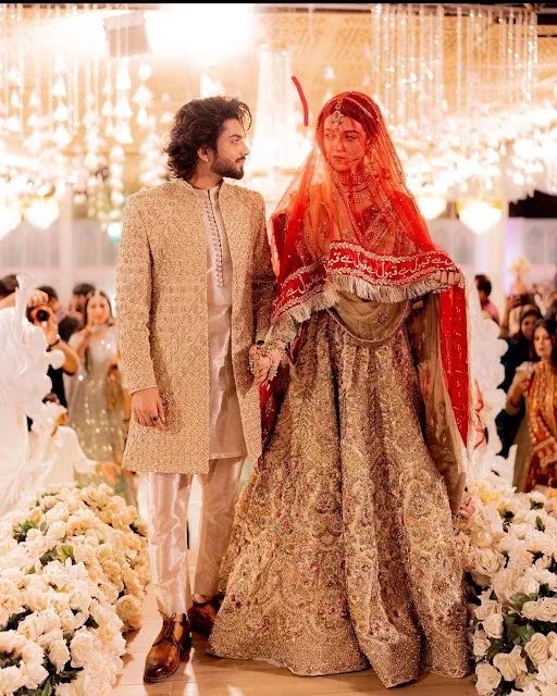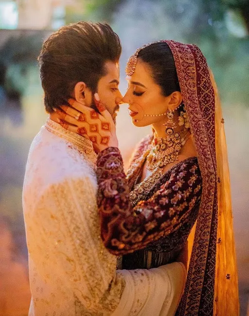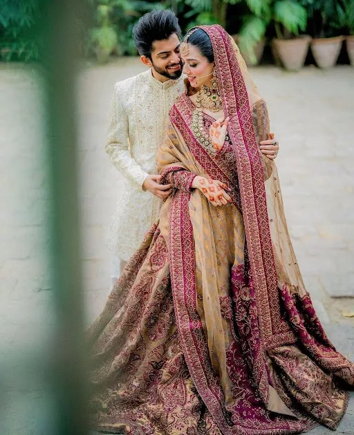 The couple dressed in royal shades for their rukhsati as well. Zarnab dressed in a maroon hued jora with a beige veil. Laraib donned a ivory hued sherwani for the event and draped a shawl in the same color.