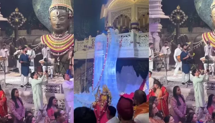 In another viral video, we can spot the eminent singer-cum-composer, Amit Trivedi performing live during the Shiv and Shakti puja in Antilia. The singer looked handsome in a blue kurta with white pants, and was heard enchanting the guests over there with his voice. He was singing his song, Namo Namo, from the film, Kedarnath. In the same video, we can also spot Anant Ambani and Mukesh Ambani performing the puja rituals.