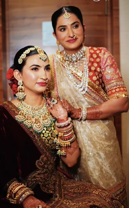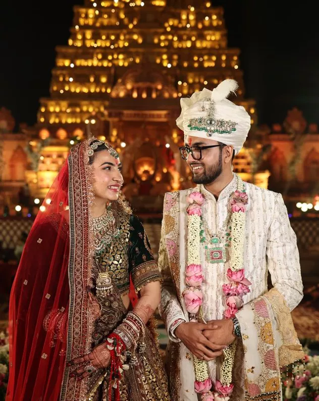 For the wedding, Deepika surely looked like a queen in a sophisticated velvet lehenga choli adorned with golden detailing. While her choli was green in colour, she paired a maroon lehenga with it. Deepika used two dupattas, one pinned to her shoulder and another on her head, to complete her bridal outfit. She opted for several pieces of jewellery, like a heavy statement polki necklace, pair of earrings, matha patti, choodas and bangles, to accessorise her bridal joda. Deepika went for blushed cheeks, perfectly lined eyes and pink lips to accentuate her overall look. Moreover, her groom, Nayan, complemented her in a white sherwani paired with a multi-coloured doshala.