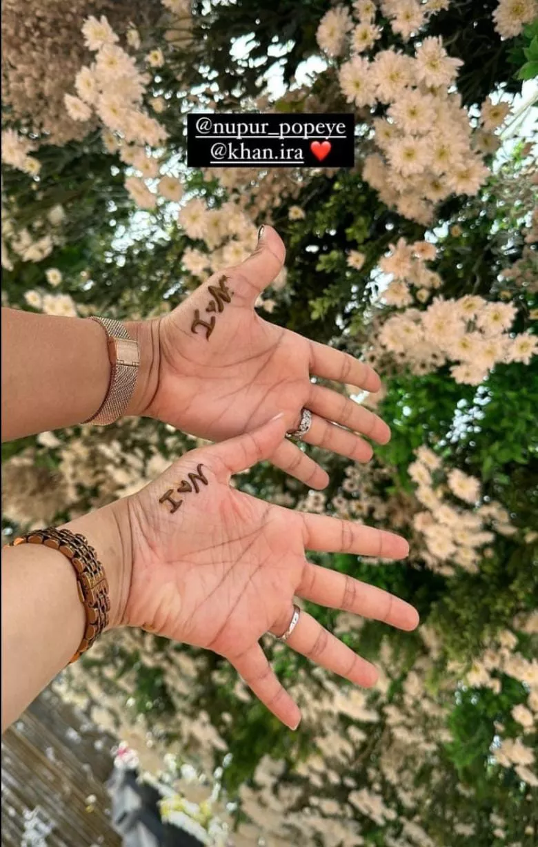 On January 8, 2024, we got some love-filled glimpses from Ira and Nupur's mehendi ceremony. For the ceremony, Ira was decked up in a white-hued ensemble with a sheen makeup and a gipsy-adorned braided hairstyle. She teamed her look with a stone-studded choker and matching earrings. On the other hand, Nupur, who was seen posing mushily with his bride-to-be looked dapper in a pink-toned kurta. He teamed his look with a chocolate-hued sleeveless jacket. Another photo featured Ira and Nupur's mehendi-clad palms, and it was simply minimal yet elegant, featuring their name initials with a heart sign in between.