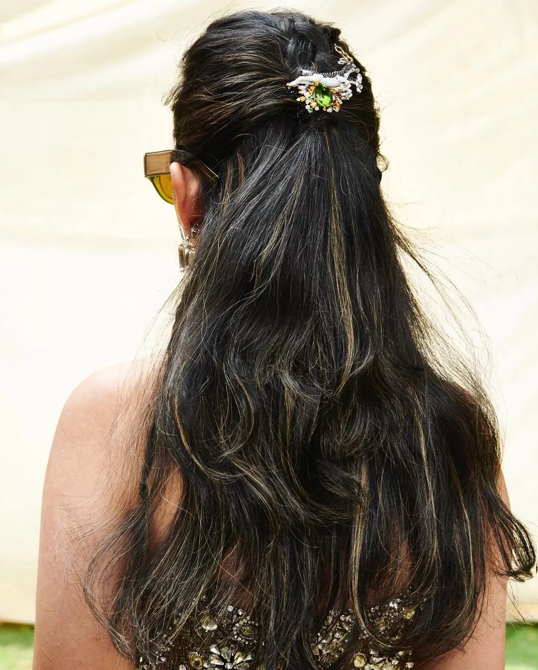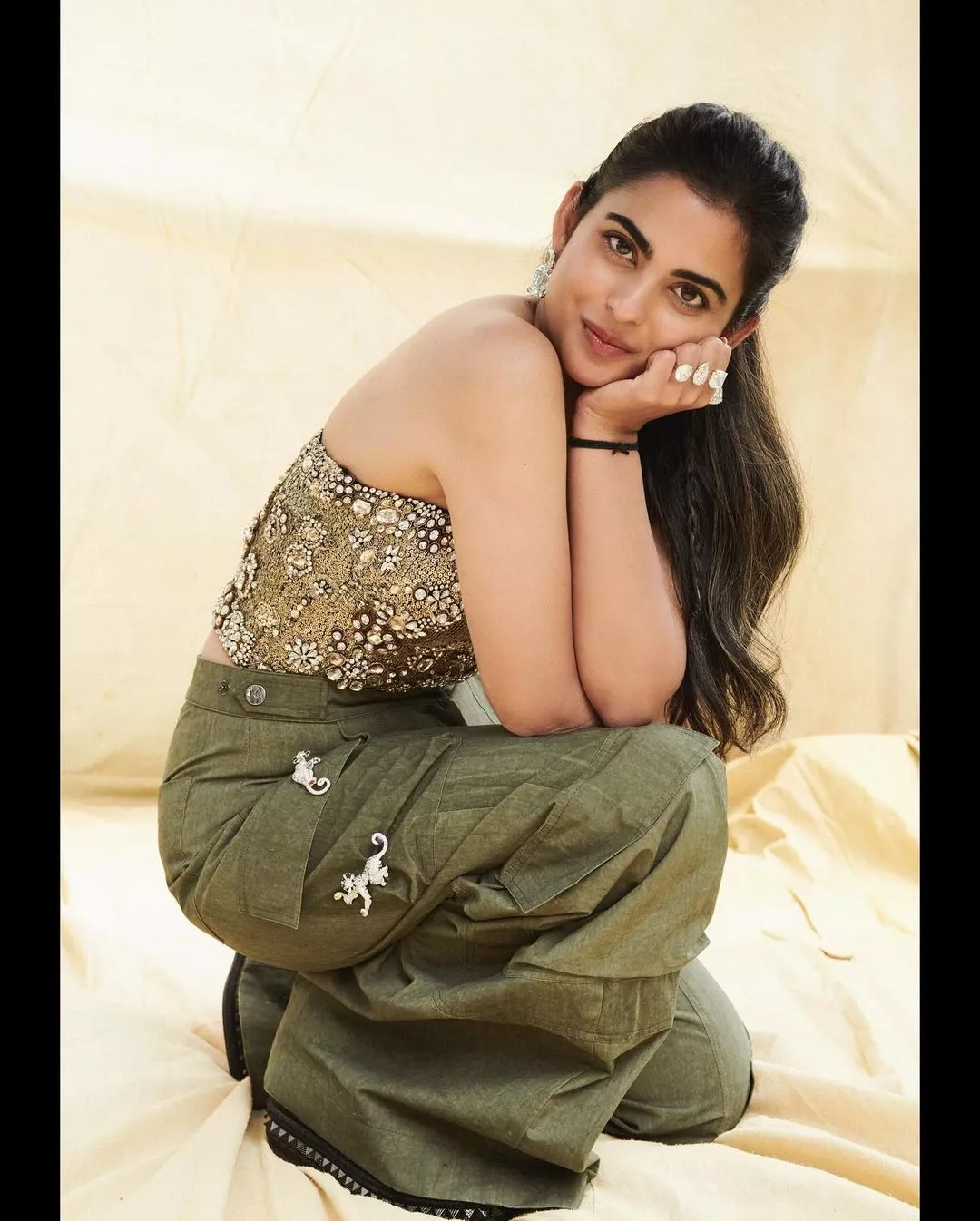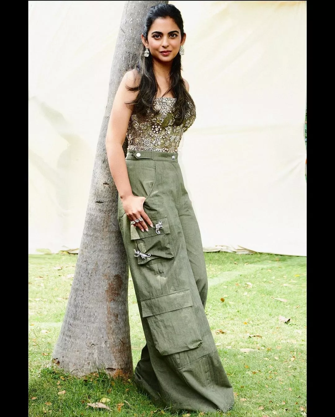 Taking to her IG handle on March 3, 2024, renowned stylist, Anaita Shroff Adajania shared a sneak peek into Isha Ambani's casual chic look for the jungle safari event in Jamnagar. The diva opted for an olive-green-hued strapless corset top adorned with stone embellishments. She paired it with green-coloured wide-legged pants, which had unique animal-shaped brooch attached on the side pockets.