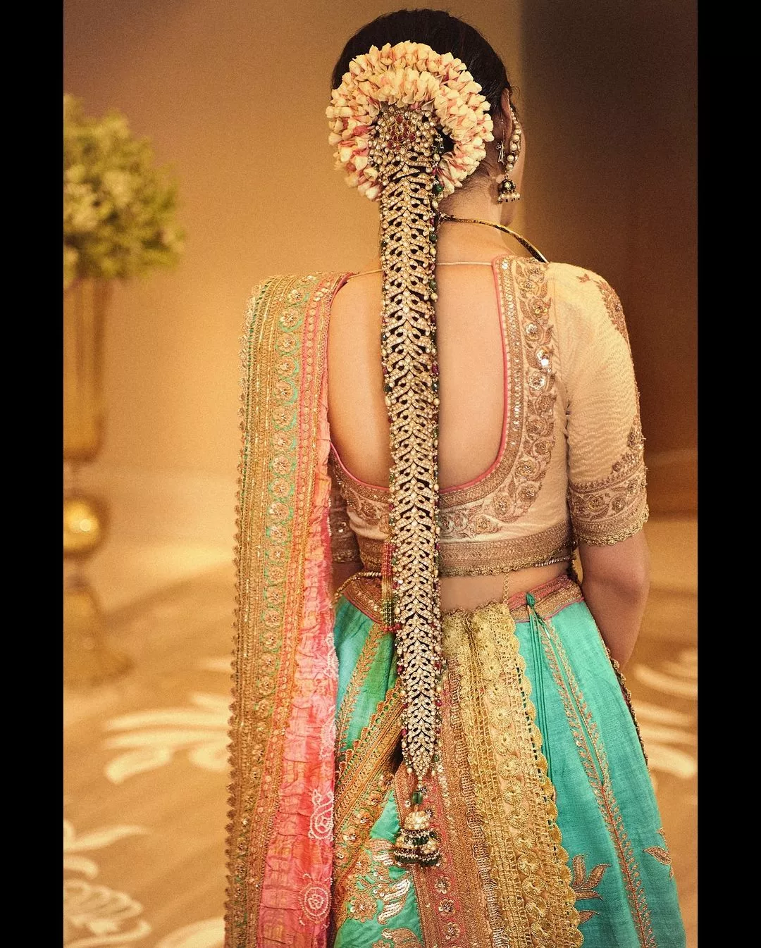 Isha styled her look with a huge emerald jadau neckpiece, heavy earrings, a cocktail ring, and beige-toned bangles. Famous celebrity makeup artist Micky Contractor kept her look soft and natural with defined brows, soft eyes, and nude-toned lipstick. A black bindi and hair tied in a braid completed her look. However, the highlight was her stunning real gold hair accessory, which was pinned to her braid from Birdhichand jewellers.
