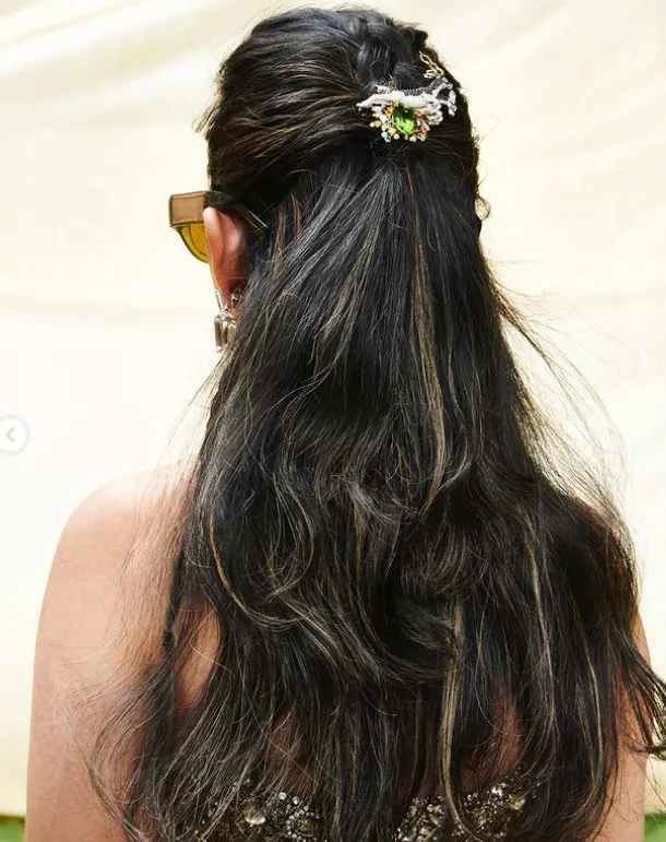 Isha clipped two monkey-shaped brooches adorned with pricey diamonds, white gold, and coloured sapphires. The brooches were from the Arche de Noe collection of the luxury jewellery company Van Cleef & Arpels. Isha also opted for a reindeer clip to accentuate the look of her hair. According to a jewellery enthusiast, Shuchi Madan, the brooches cost between Rs 2.25-5 crore each.