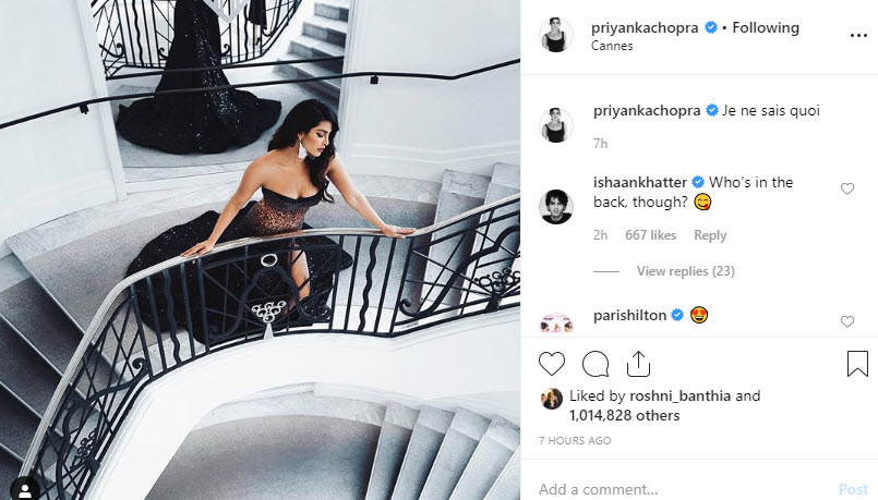 Priyanka Chopra Jonas is currently in Cannes to walk the red carpet today (May 17, 2019) for Cannes Film Festival 2019. Priyanka shared a lot of pictures from her Cannes 2019 red carpet but one which caught our attention was wherein she was doing her photo shoot on the stairs, and guess who commented on the photo? Well, it was her ex's brother! Yes, Priyanka Chopra Jonas' ex-boyfriend, Shahid Kapoor's brother, Ishaan Khatter commented, "Who’s in the back, though?," on the following pictures of PeeCee: