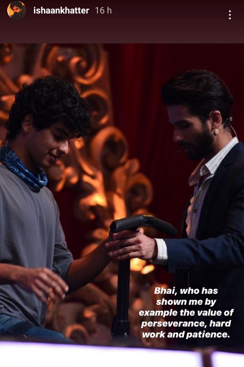 Ishaan Khatter took to his IG handle on July 6, 2020, and shared two pictures of him with his elder brother, Shahid Kapoor on his IG stories. In one of the pictures, Shahid and Ishaan can be seen on a stage, while Shahid was looking extremely handsome in a black tux, Ishaan rocked the 'boy-next-door' look. Ishaan wrote a sweet message atop the picture which can read as "Bhai, who has shown me by example the value of perseverance, hard work and patience." Another picture that Ishaan posted was a blast from the past. In the picture, baby Ishaan can be seen sitting in the lap of his bhaiya, Shahid, while he's busy reading a newspaper. Ishan wrote, "My pillar to lean on" atop it. Check out the pictures below:
