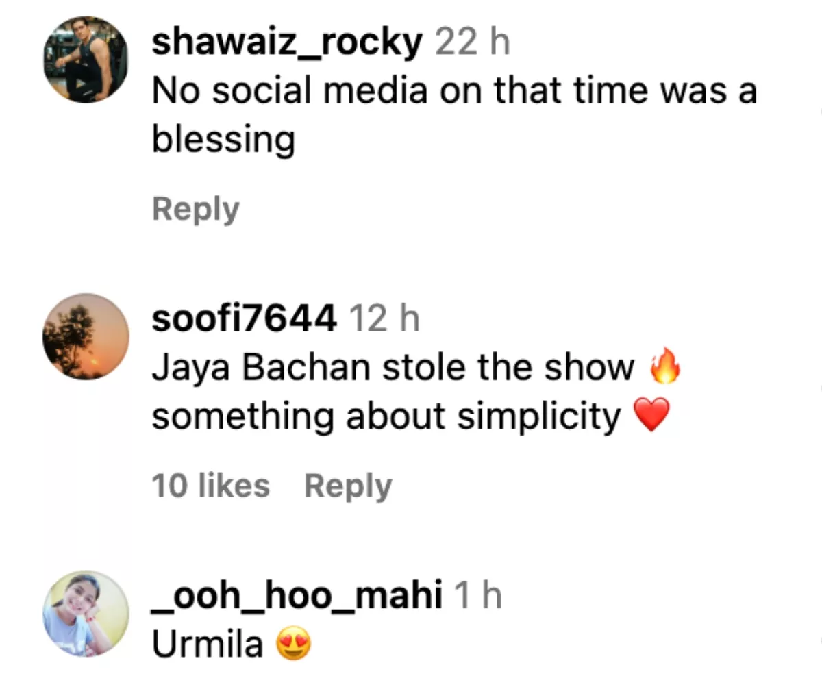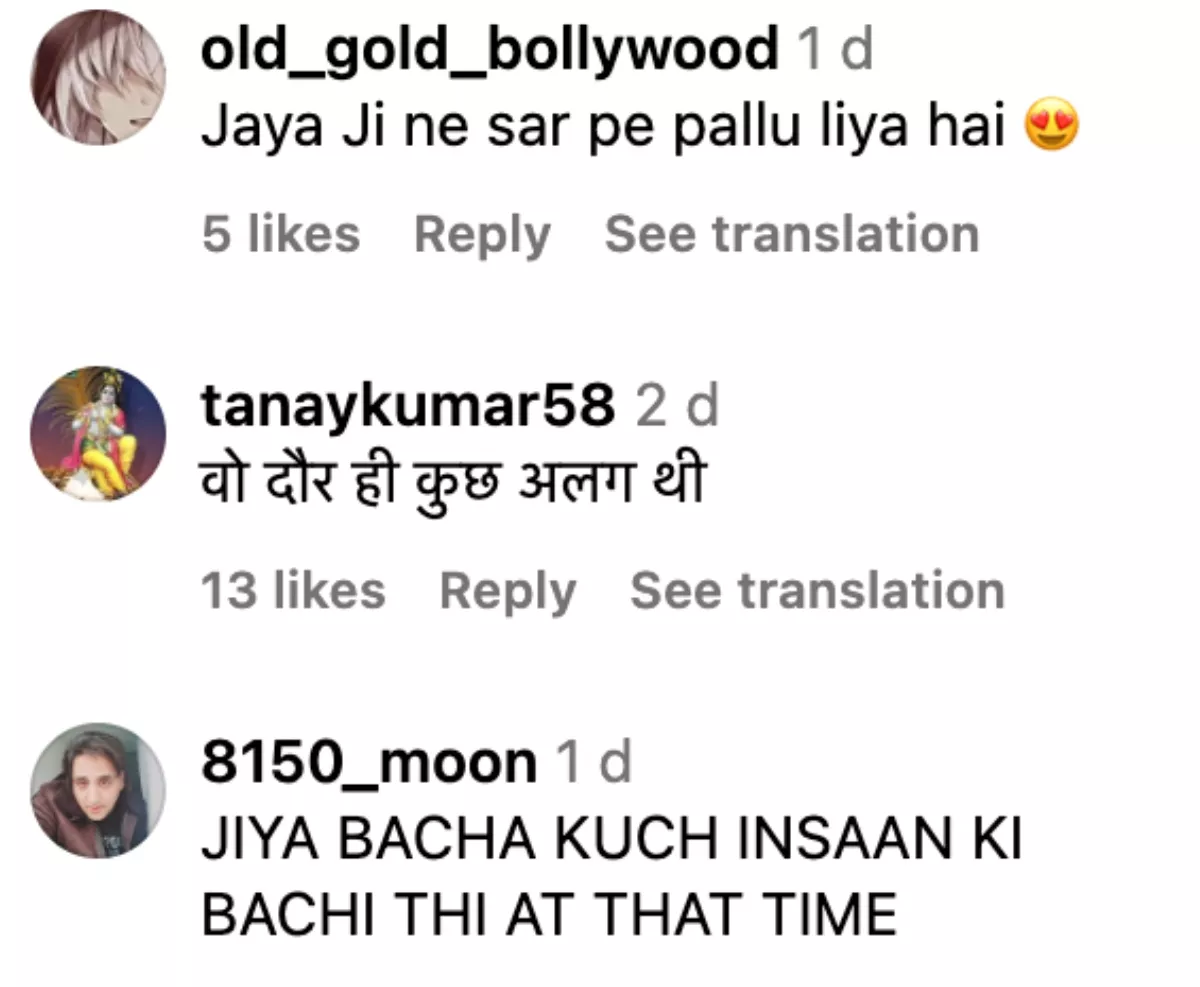 As soon as the video was uploaded, netizens expressed their disbelief in the comment section. One user wrote, "Jaya Ji ne sar pe pallu liya hai." Second user commented, "Superstr ki patni hone ke bawjud Jaya Bachchan ne sir par pallu daal rakha hai. Yeh. tha '90s ka suhana daur." Another one wrote, "Jaya Bachan stole the show. Something about simplicity."