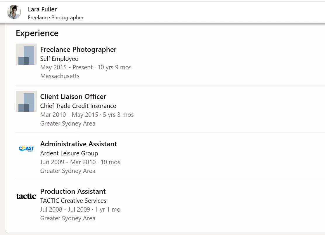 According to Lara's LinkedIn profile, she has a degree in Bachelor of Science, Photojournalism and Communication from Boston University. Lara was a production assistant for TACTIC Services, then an Administrative Assistant with Ardent Leisure Group. She was also a Client Liason Officer with Chief Trade Credit Insurance and has been a freelance photographer for 10 years.