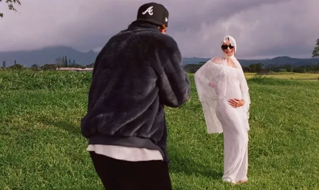 Hailey, the epitome of elegance, donned a stunning lacey white-hued off-shoulder mermaid gown from the renowned Saint Laurent. She added a touch of mystery with a veil cape that cleverly doubled as a hoodie, and completed her look with chic sunglasses. Justin, on the other hand, opted for a more casual yet stylish look, wearing cargo pants with a black jacket over a white t-shirt and a reversed cap.