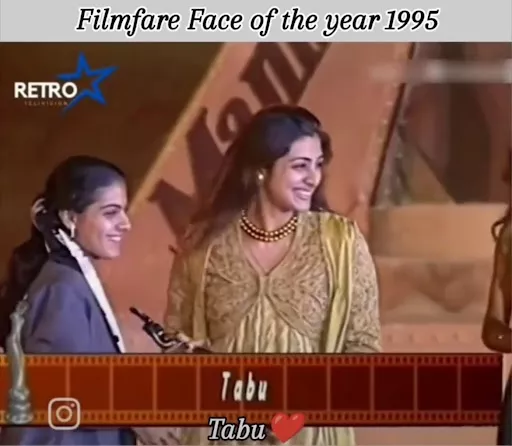 As Kajol announced Tabu's name as the winner of the Filmfare Face of the Year 1995 award, she looked visibly upset. However, Tabu, looking radiant as ever, ran towards the stage to receive the award and greeted Kajol with a smile. The actress looked elegant in a golden-hued frock suit paired with a dupatta, and she let her hair open. A necklace, matching earrings and bangles completed Tabu's look.