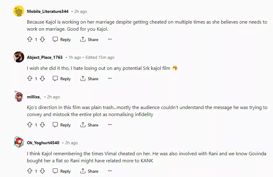 This clip was shared on the discussion platform, Reddit, and the people on the internet have similar thoughts to Kajol’s point of view. One user commented, “That entire movie is so senseless. Rani’s character is bitter with her husband, who has done nothing bad to her, but falls in love with a cheating husband who is also very insecure about his wife’s success.” Another one wrote, “Kjos obsession with whitewashing infidelity is weird.”