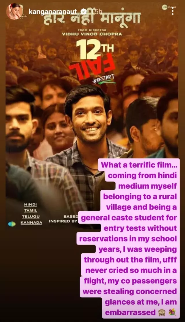Kangana Ranaut also heaped praise on Vikrant Massey for his performance in 12th Fail. She took to her IG story, sharing the film's poster, and wrote a lovely note commenting on Vikrant's 'beyond amazing' portrayal of a rural boy. Kangana noted her similarities with Vikrant's character, stating that she, too, came from 'Hindi medium' and belonged to a rural village. Not only that, like his character, she was also a general caste student for entry tests without reservations during her schooling. Kangana further added that the relatability of the film and Vikrant's performance had her bawling her eyes out on a flight.