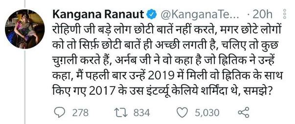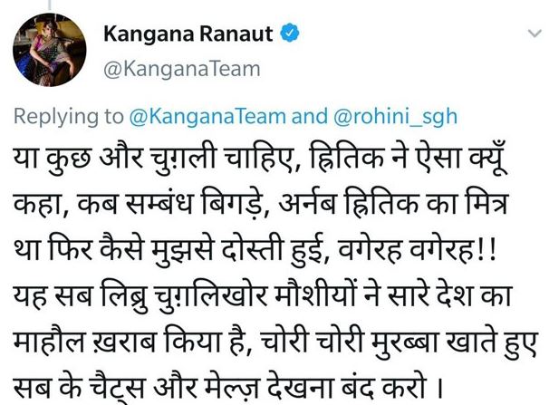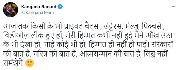 In another tweet, Kangana quoted a user named Rohini and told her that Arnab Goswami is not the one to be blamed for the things that have surfaced on the internet about her, as it was Hrithik Roshan, who told such wrong things about her. Her tweet can be read as "Rohini ji, high-level people do not talk about petty things, but petty people only like to talk about petty things. Have it your way, let us gossip a little. Arnab ji just said what Hrithik told him. I first met him in 2019, and he was ashamed of his 2017 interview with Hrithik. Understand?" The actress concluded her take on Arnab's leaked WhatsApp chats' controversy with a short note on morality. Her tweet can be read as "Till date, I have never dared to see anyone's leaked private chats, letters, emails, pictures and videos, no matter whose it has been. It is a matter of moral values, character and self-respect. Librus will not understand." (Don't Miss: Smriti Irani Shares A Throwback Picture Of Daughter, Zoish As She Prepares For Her Board Exams)