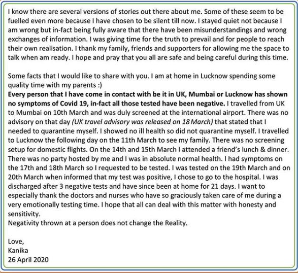 For the uninitiated, Kanika Kapoor was admitted at the Sanjay Gandhi Postgraduate Institute of Medical Sciences after the singer had tested positive for coronavirus. From the six tests, the popular singer had tested positive for the first five tests but found negative in the final one. After some days in the observation of doctors, the singer was discharged from the hospital a few weeks ago. Recently, on April 26, 2020, Kanika took to her Instagram handle and posted a long note clarifying the false claims that were circulated about her across the internet. A little excerpt from her long note could be read as “I know there are several versions of stories out there about me. Some of these seem to be fuelled even more because I have chosen to be silent until now. I stayed quiet not because I am wrong but in fact, being fully aware that there have been misunderstandings and wrong exchanges of information. I was giving time for the truth to prevail and for people to reach their realisation.” Take a look.