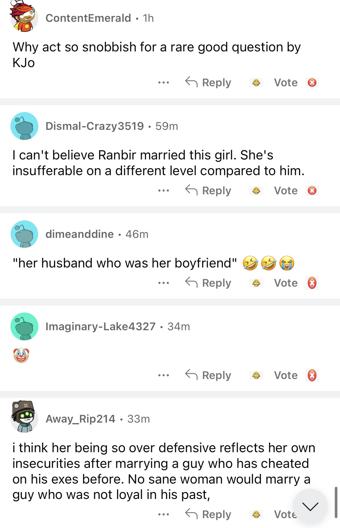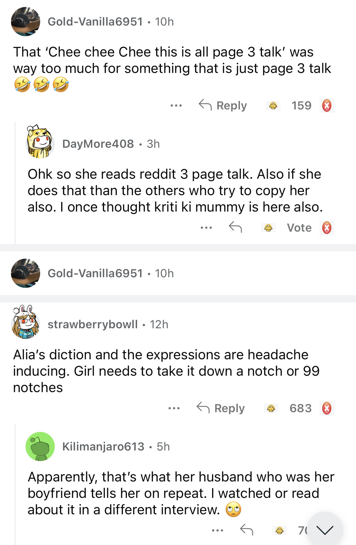 As soon as Alia Bhatt's video was shared on Reddit, netizens were quick to react to the same. One user commented, "That 'Chee chee Chee this is all page 3 talk' was way too much for something that is just page 3 talk." Another one wrote, "Oh so she reads reddit 3 page talk. Also if she does that than the others who try to copy her also. I once thought kriti ki mummy is here also." Meanwhile, a third netizen penned, "I think her being so over defensive reflects her own insecurities after marrying a guy who has cheated on his exes before. No sane woman would marry a guy who was not loyal in his past."